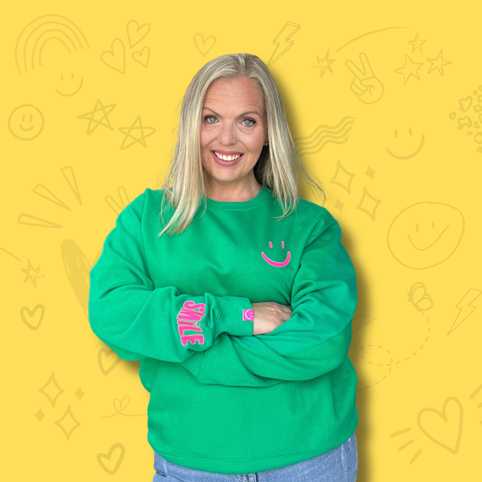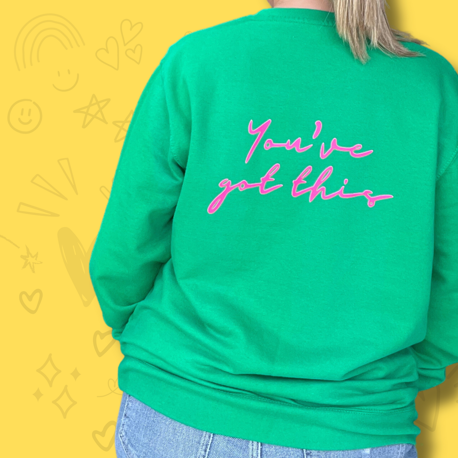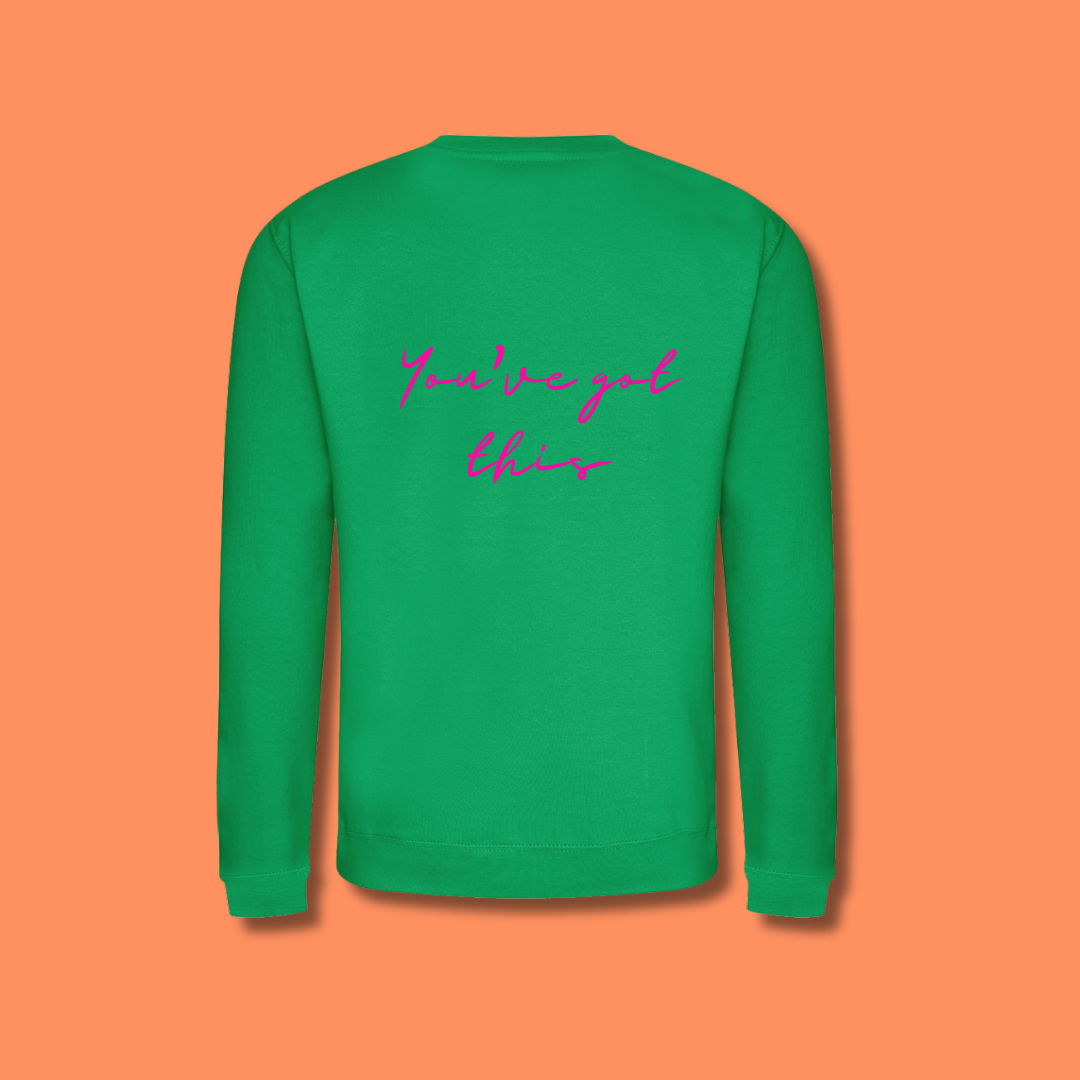Our 'You've got this' sweater in green and neon pink, featuring our smiley on the front, the 'You've got this' slogan on the back and our Smile on the sleeve. Super soft and the perfect sweater for every day.
