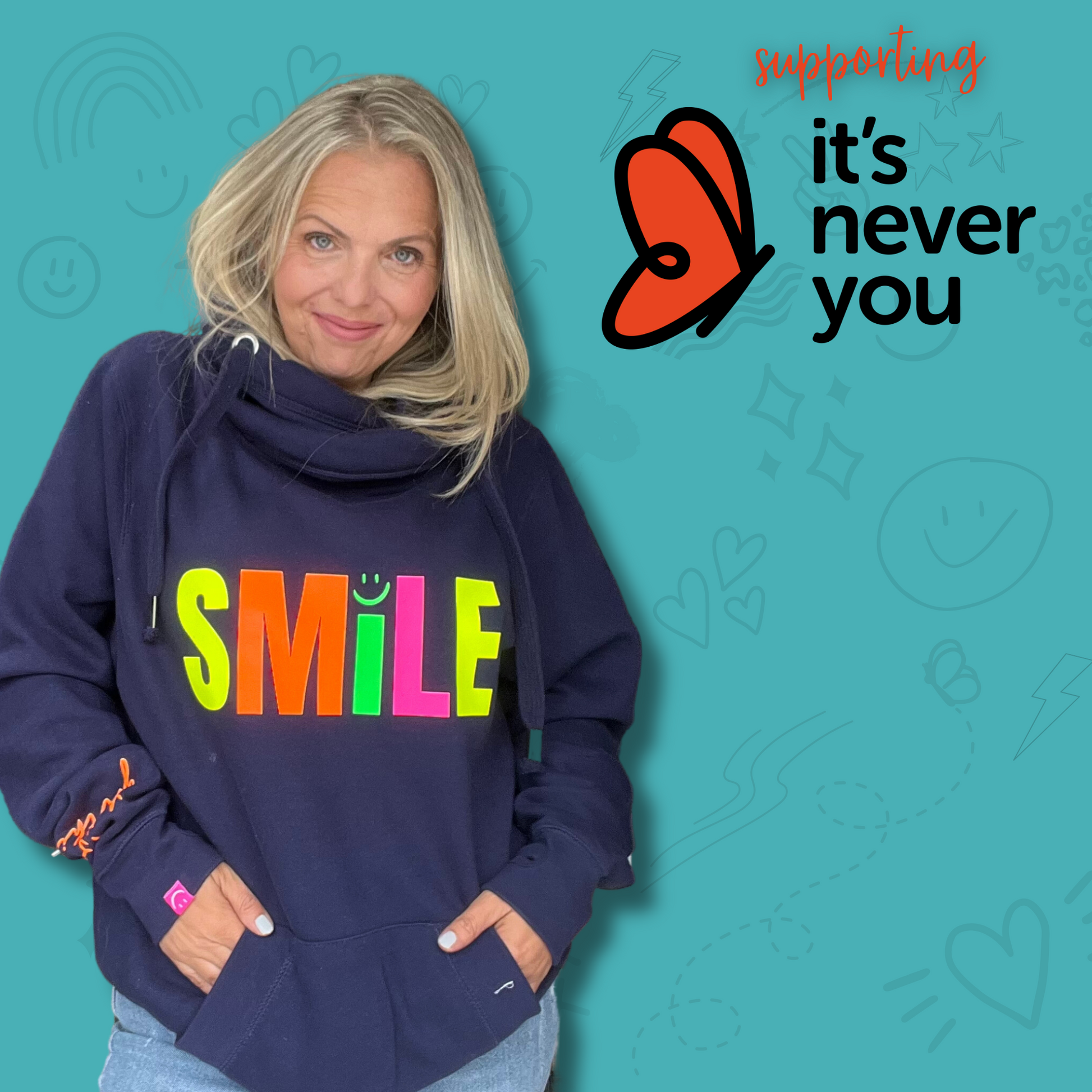 For every Navy and Neon Smile Cowl Hoodie sold, £5 will be donated to the charity 'It's Never You'. It's Never You are an incredible charity that provide help and support to parents of children diagnosed with cancer. Kathryn has received a huge amount of support from this charity during her sons cancer diagnosis. For more information about the charity please visit our charity page here.